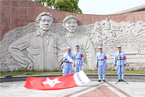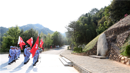 军旗的交接,是革命的传承。迎风扬起的鲜红旗帜,引领着学员们奔赴当年的革命战场。